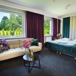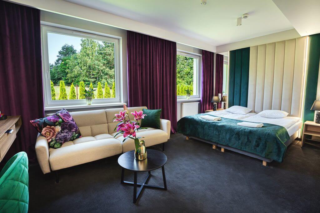 Na naszych Gości czeka przestronny pokój wyposażony w wysokiej klasy meble – od miękkiego, dużego łóżka z luksusowym materacem, po stylowe meble. Duże okna zapewniają mnóstwo naturalnego światła i oferują piękne widoki na okolicę, co dodatkowo potęguje uczucie przestronności.
