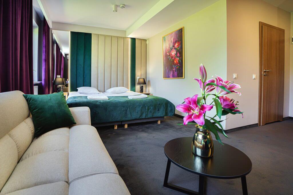 Wyjątkowym atutem pokoju w standardzie DeLuxe jest dbałość o szczegóły. Wnętrza są gustownie urządzone, z użyciem **naturalnych materiałów** i nowoczesnych akcentów, co tworzy atmosferę przytulności i elegancji. Luksusowe tkaniny, miękka wykładzina i subtelne oświetlenie pozwalają na pełen relaks i poczucie harmonii.
